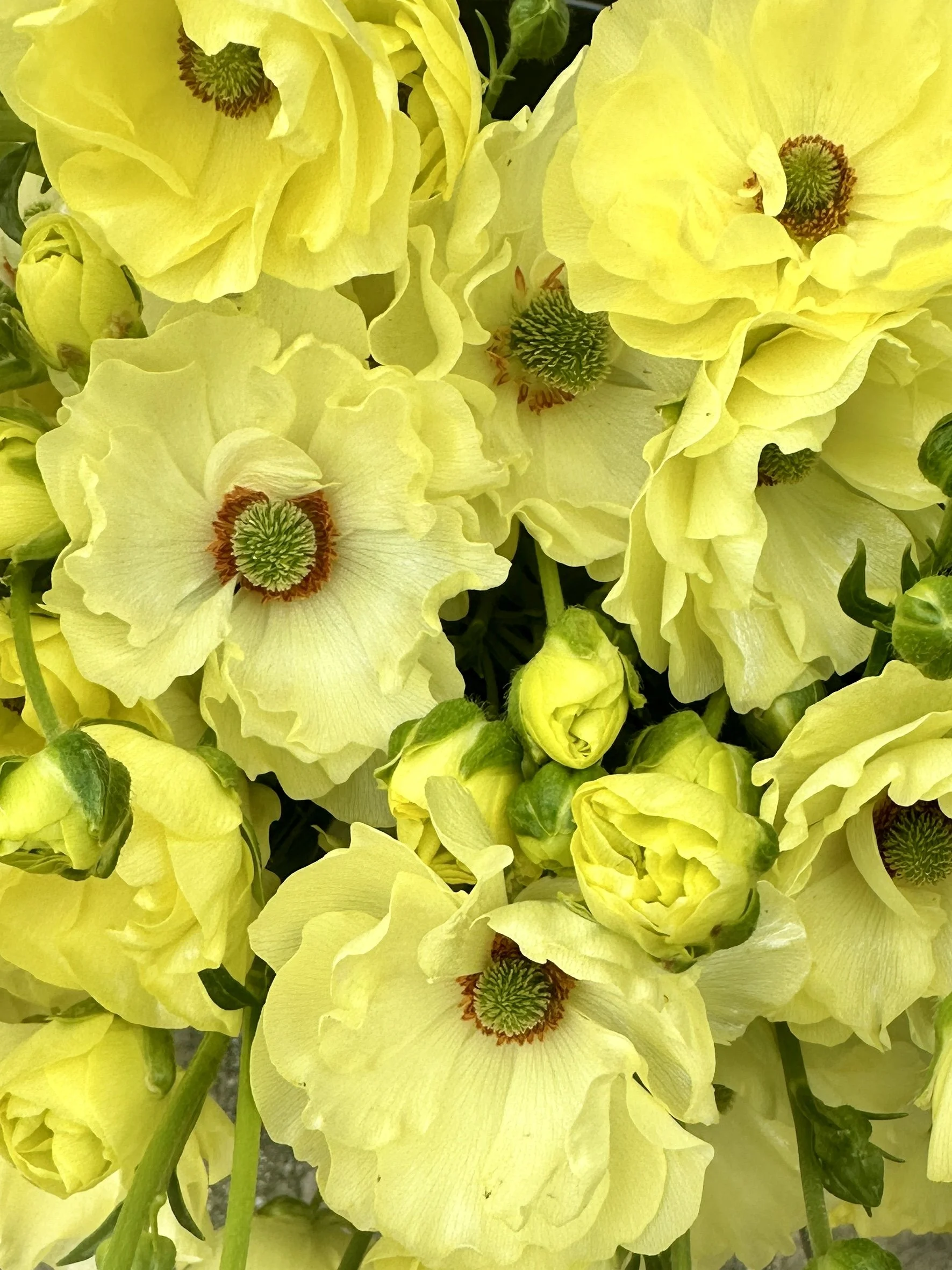 Orlaya, verbena snowballs, flowering shrubs, scabiosa, narcissus, anemones, ranunculus, butterfly ranunculus, hellebores