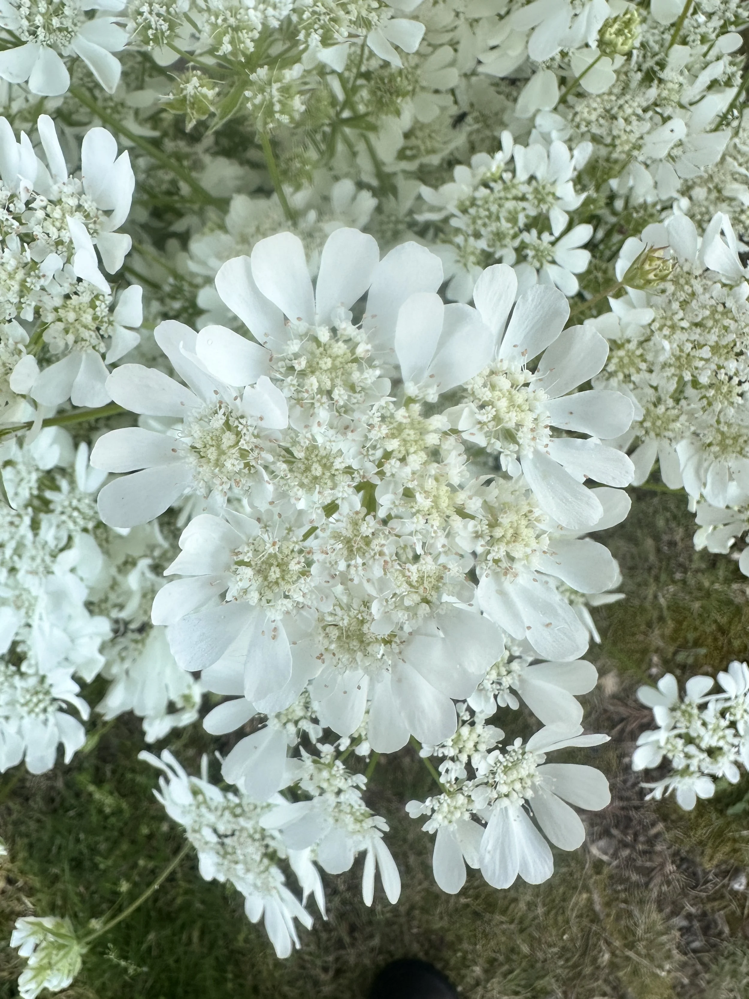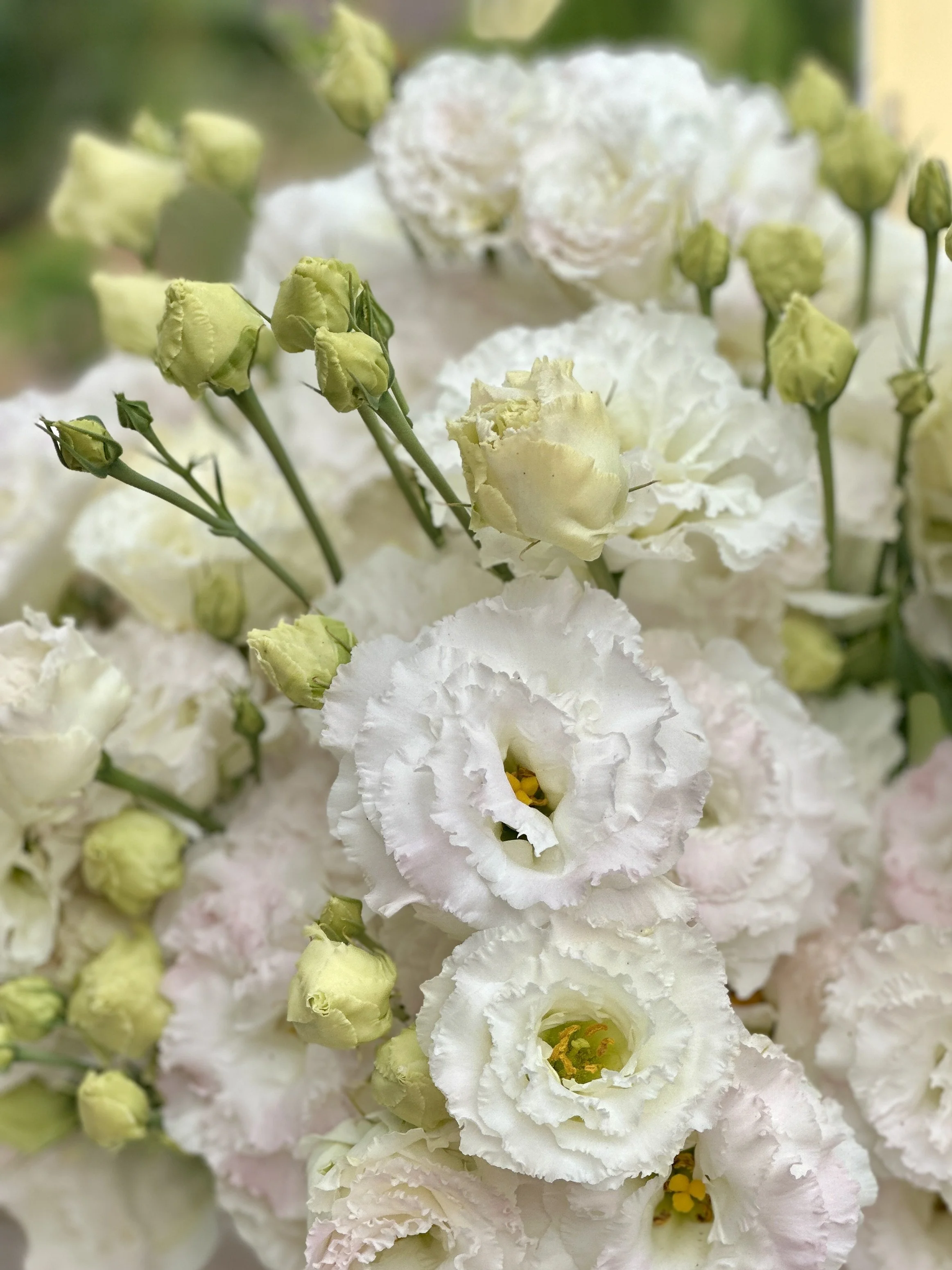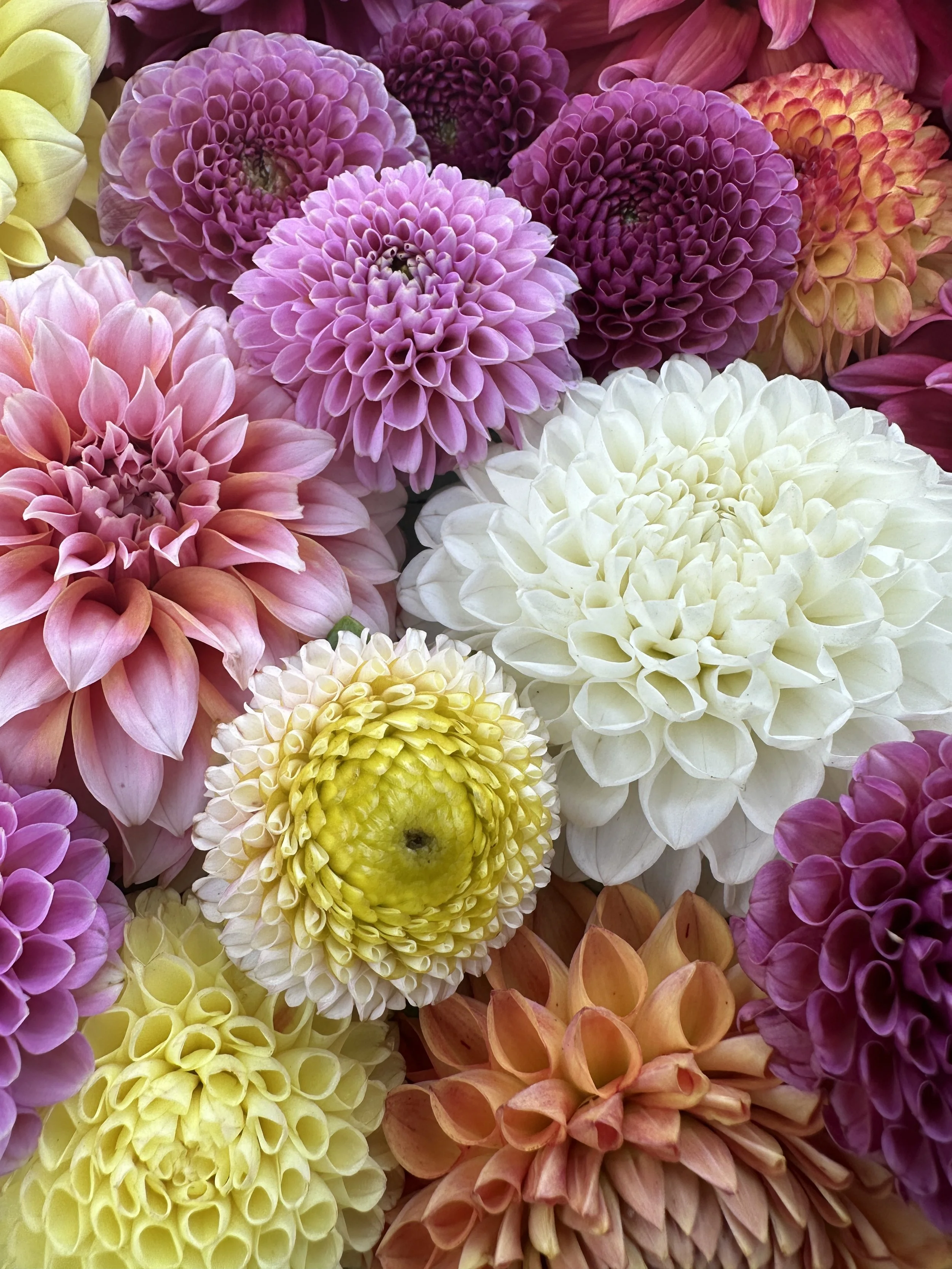 Scabiosa, delphinium, snapdragons, campanula, nigella, larkspur, feverfew, dahlias, bells of ireland, rose lilies, yarrow, bupleurum, alstroemeria, chinese forget-me-nots, zinnias, marigolds, peonies
